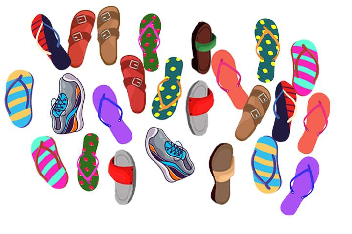 Grouping by color alone and ignoring strap geometry, counting pairs before isolating single-instance designs, losing track of items due to scanning visually instead of marking groups, treating mirrored orientation as irrelevant and pairing two left shoes