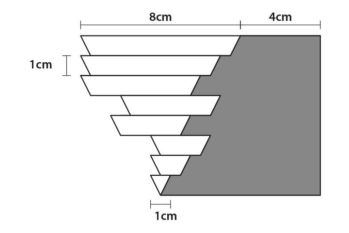 Horizontal translation does not affect area. Treat the figure as an isosceles triangle with 8 cm height. Calculate the area of the rightmost 4 cm strip using similar triangles or integration. The shifting of middle segments is irrelevant.