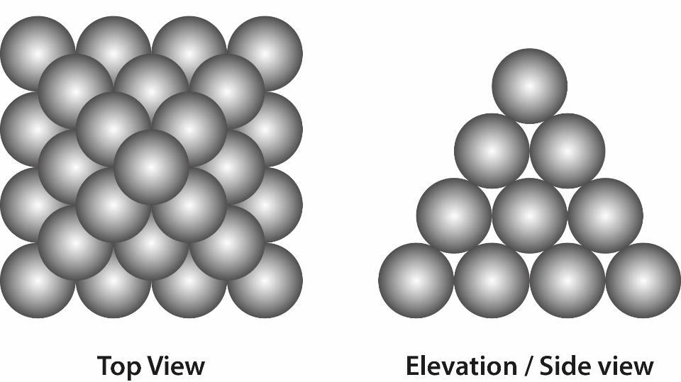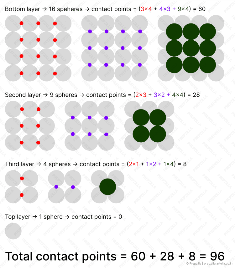 Count sphere-sphere contacts layer by layer. Four layers: 16 (4Γ4), 9 (3Γ3), 4 (2Γ2), 1 sphere. Calculate horizontal contacts within each layer, then vertical contacts between stacked layers. Avoid double-counting.