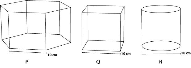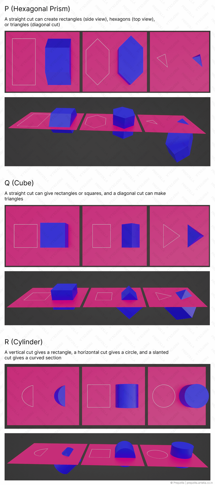 Cylinder (R): Has a curved surface β can form circles, ellipses (curved shapes). Vertical cuts β rectangles or even squares. Cube (Q) & Hexagonal Prism (P): Flat faces β only polygons. Can form rectangles, squares, and isosceles triangles from angled cuts. Only hexagonal prism (P) can produce a regular hexagon when cut parallel to its base.