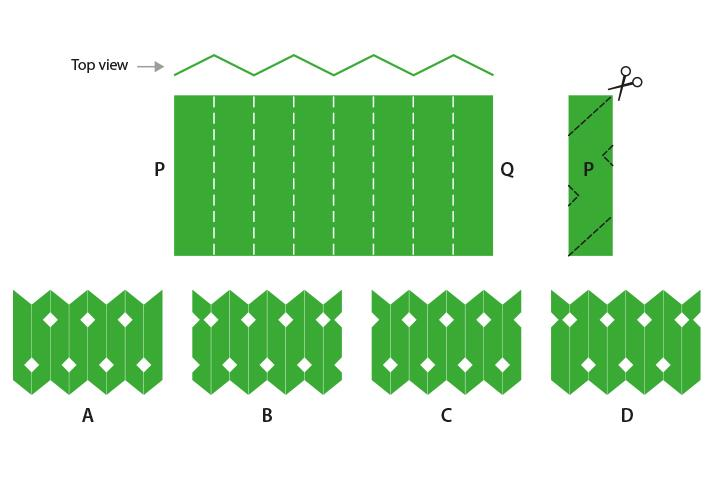 Visualizing the result when paper is folded along lines and cut, then unfolded to reveal a symmetrical pattern. Paper folded accordion-style (7-8 vertical folds), cuts made on top and bottom edges create V-shaped notches. Each cut goes through ALL layers, creating diamond/rhombus shapes when unfolded.