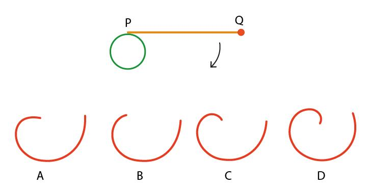 Understanding the path traced by a point on a rod as it rolls around a circle, creating a trochoid curve. Rod length equals circle circumference. As rod rolls tangentially, point Q traces a U-shaped or cycloid-like curve that dips down and comes back up.