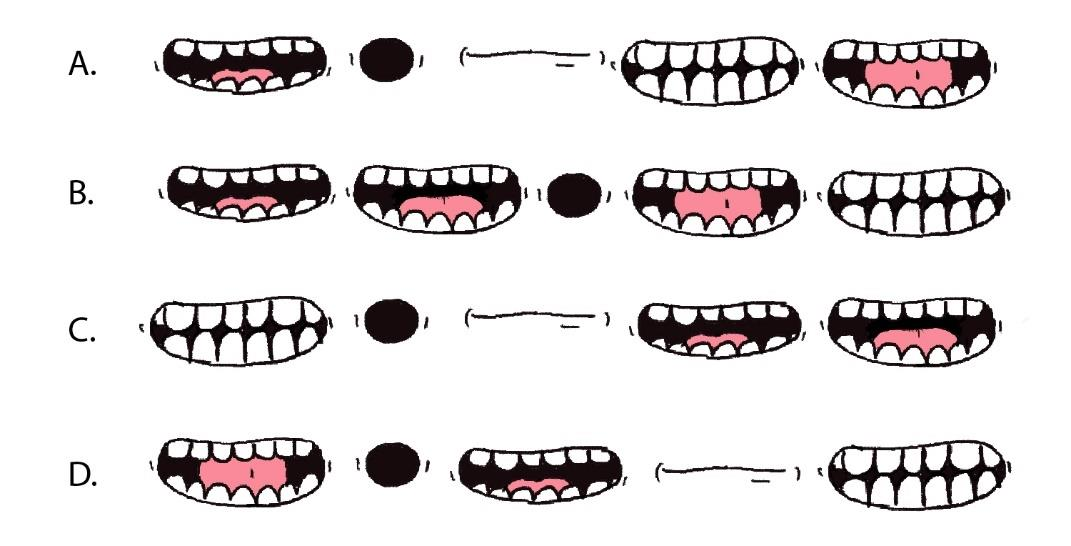 Identifying correct phonetic mouth positions for pronouncing 'See you later' in sequence. Break down: 'See' (lips stretched wide, teeth visible), 'you' (lips rounded/puckered), 'la' (mouth open, tongue visible), 'ter' (teeth visible, lips slightly pulled back).