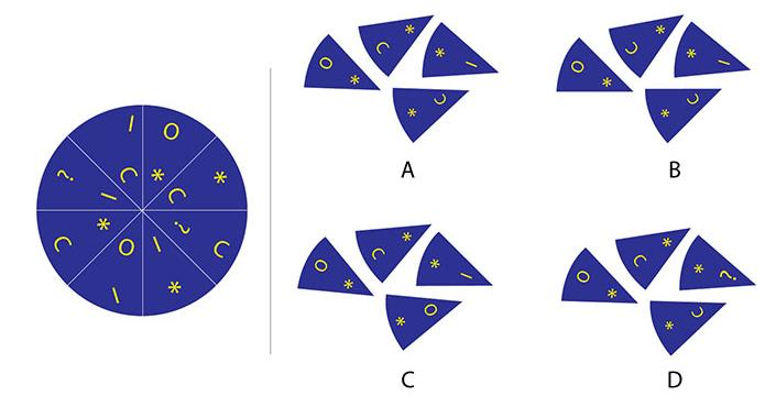 Identifying which option contains all four distinct pieces when decorated disc is cut along specific lines.