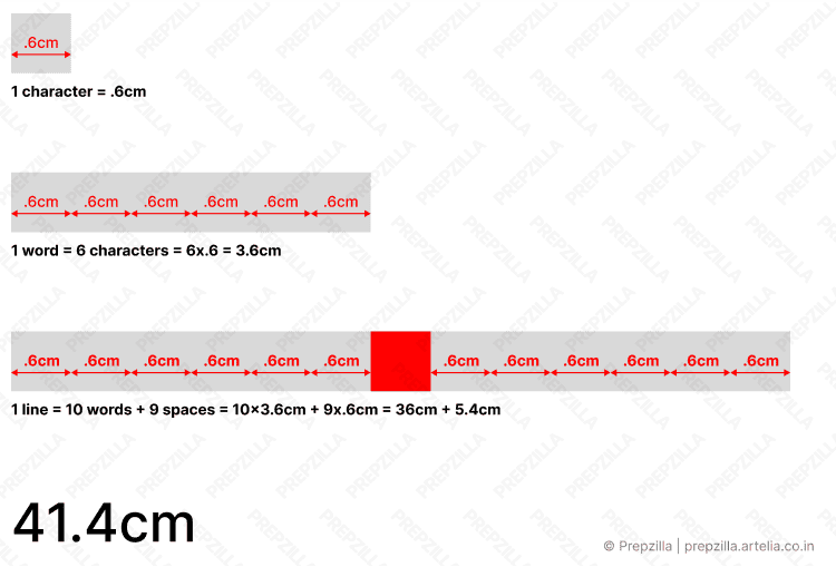 Count all characters including spaces in fixed-width font. 10 words x 6 chars = 60 characters, plus 9 spaces between words = 69 total. Multiply by 0.6 cm = 41.4 cm.